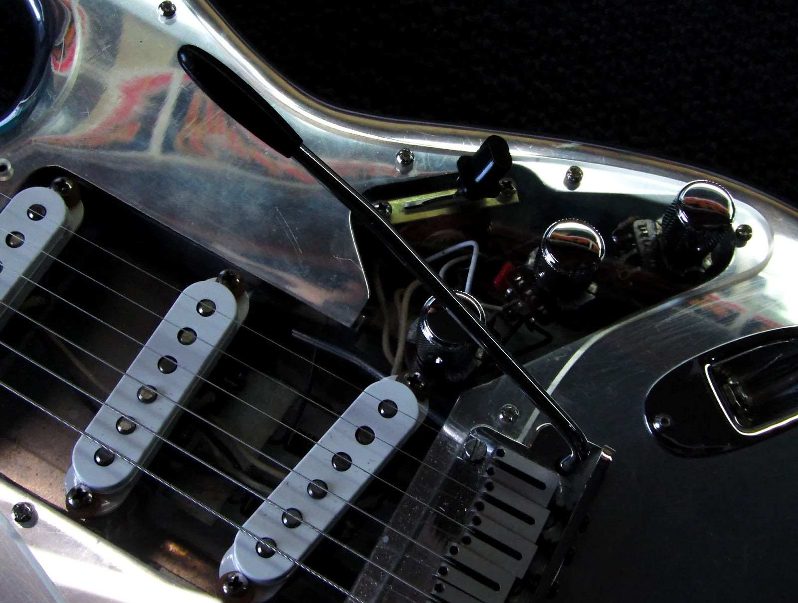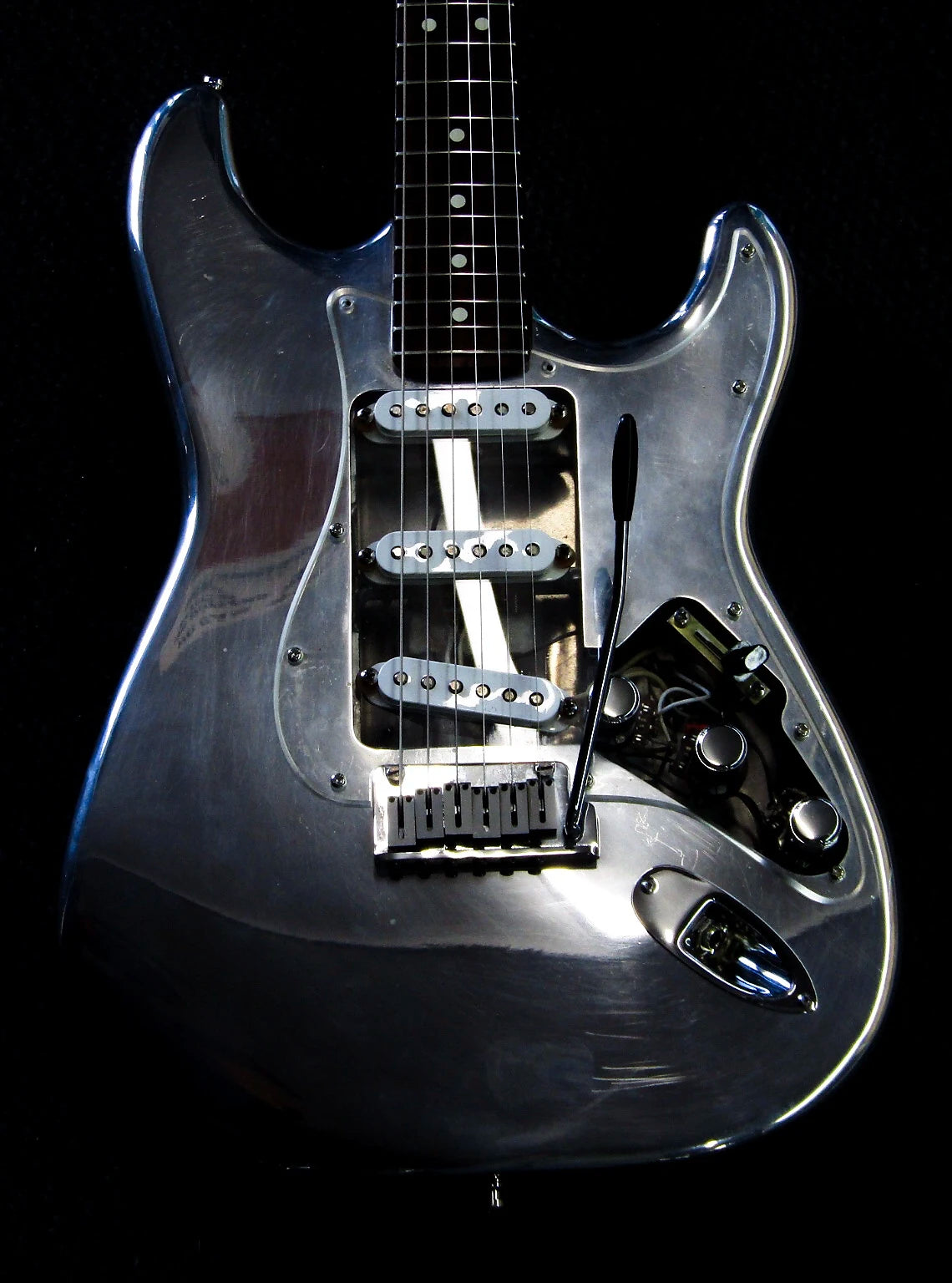 This unusual guitar is essentially a donor 1993 American Standard Strat mounted on a handmade aluminium Strat body. Bought in bits by Guitars Plus from a regular client‘s sons whom had passed away.
